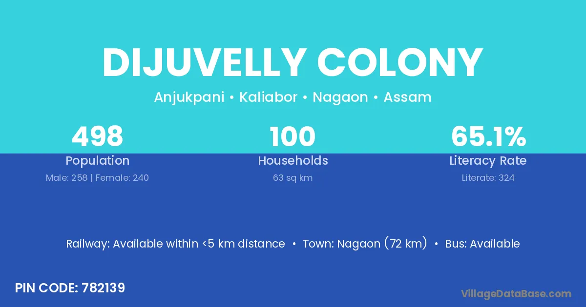 Dijuvelly Colony village has a total population of 498 people, of which 258 are males and 240 are females.