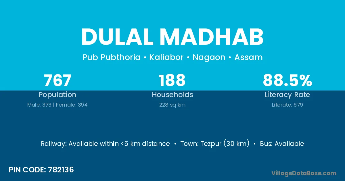 Tezpur (30 km) is the nearest town to Dulal Madhab village for major economic activities and is located approximately 30 km away.