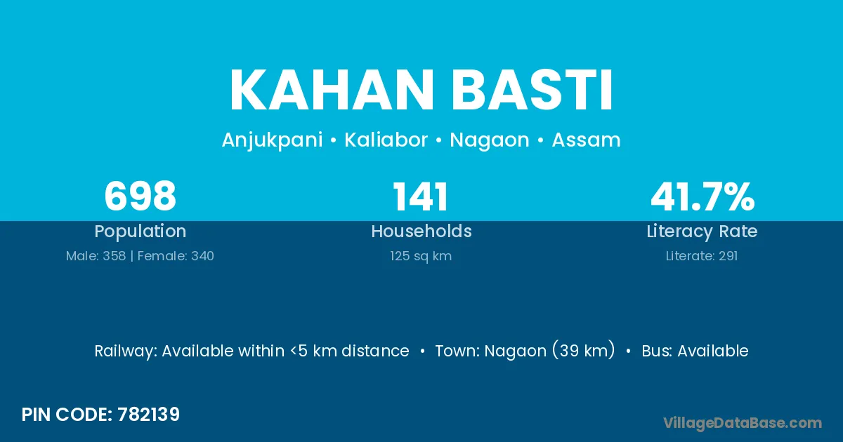 Nagaon (39 km) is the nearest town to Kahan Basti village for major economic activities and is located approximately 39 km away.