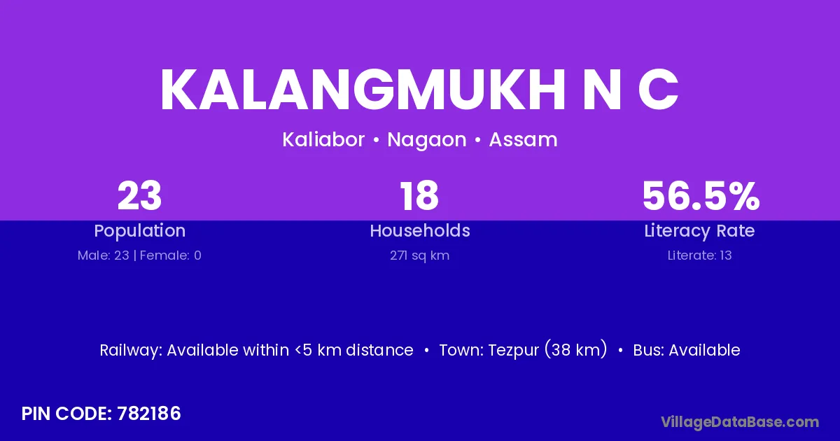 Tezpur (38 km) is the nearest town to Kalangmukh N C village for major economic activities and is located approximately 38 km away.