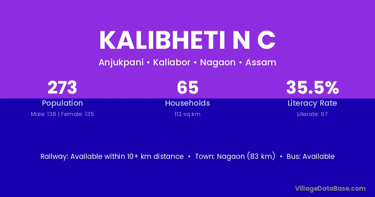 Nagaon (83 km) is the nearest town to Kalibheti N C village for major economic activities and is located approximately 83 km away.
