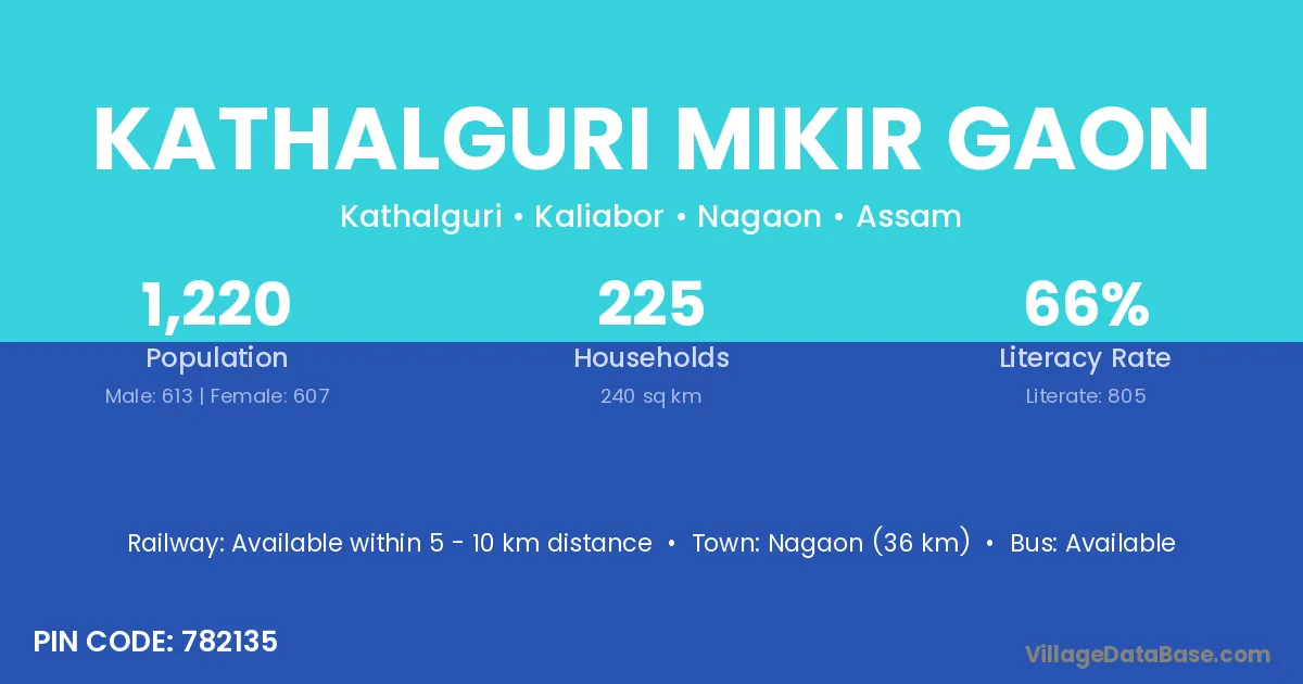 Kathalguri Mikir Gaon village has a total population of 1,220 people, of which 613 are males and 607 are females.