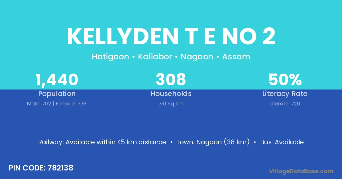 Nagaon (38 km) is the nearest town to Kellyden T E No 2 village for major economic activities and is located approximately 38 km away.