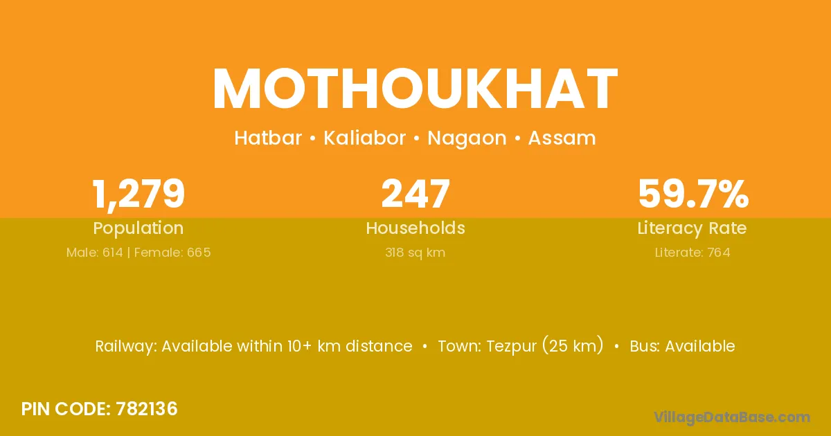 Tezpur (25 km) is the nearest town to Mothoukhat village for major economic activities and is located approximately 25 km away.
