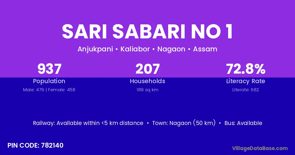 Nagaon (50 km) is the nearest town to Sari Sabari No 1 village for major economic activities and is located approximately 50 km away.