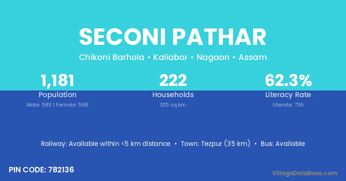 Tezpur (35 km) is the nearest town to Seconi Pathar village for major economic activities and is located approximately 35 km away.