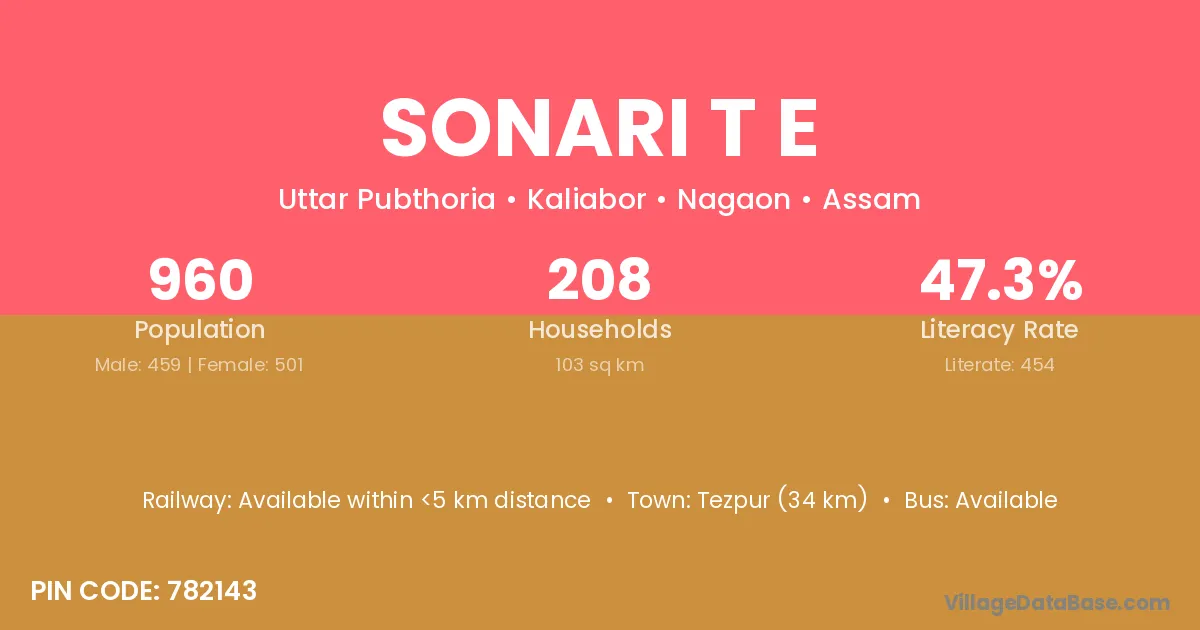 Sonari T E village has a total population of 960 people, of which 459 are males and 501 are females.