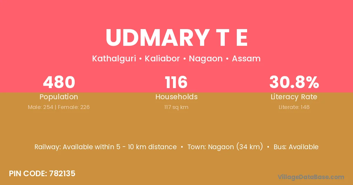 Nagaon (34 km) is the nearest town to Udmary T E village for major economic activities and is located approximately 34 km away.