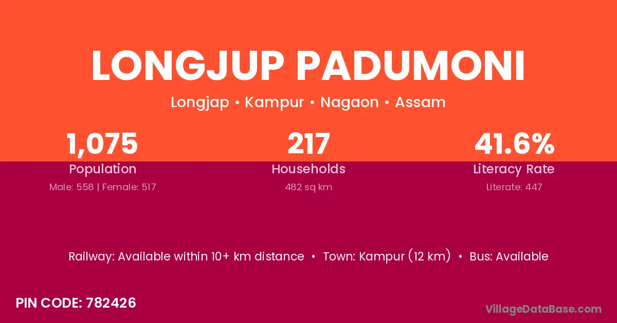 Kampur (12 km) is the nearest town to Longjup Padumoni village for major economic activities and is located approximately 12 km away.