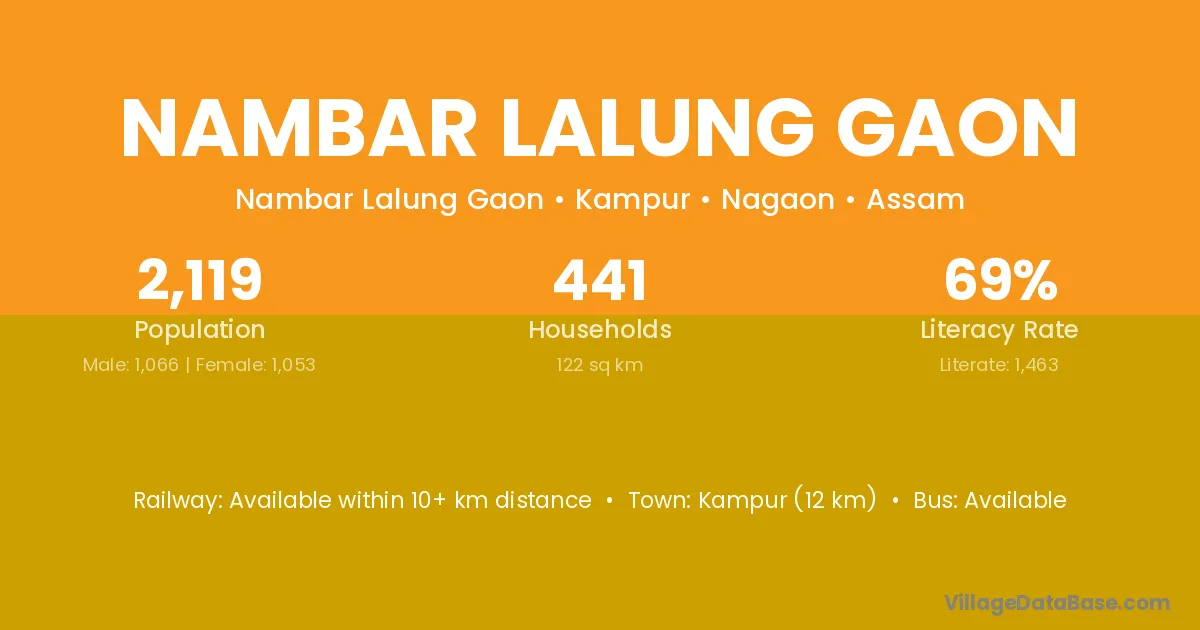 Kampur (12 km) is the nearest town to Nambar Lalung Gaon village for major economic activities and is located approximately 12 km away.