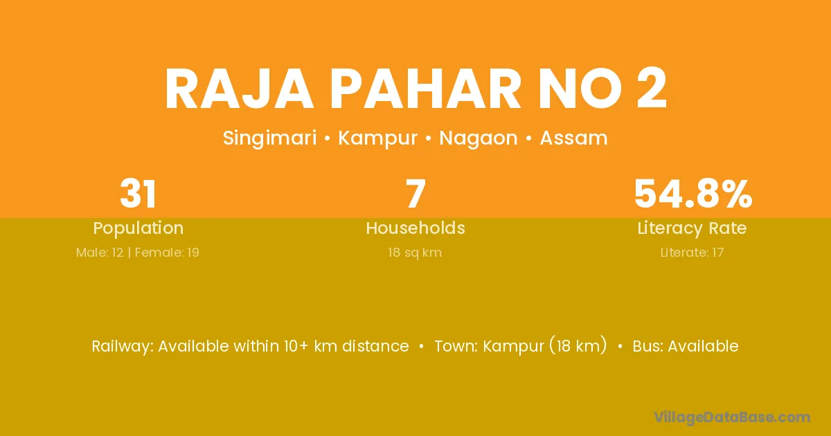 Kampur (18 km) is the nearest town to Raja Pahar No 2 village for major economic activities and is located approximately 18 km away.