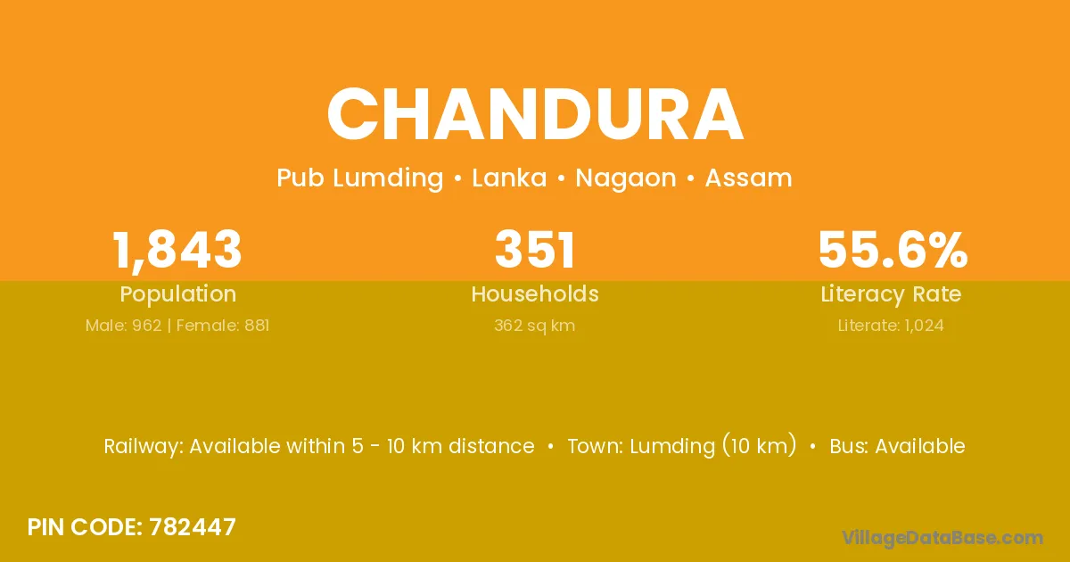 Lumding (10 km) is the nearest town to Chandura village for major economic activities and is located approximately 10 km away.