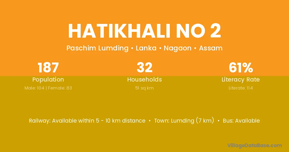 Lumding (7 km) is the nearest town to Hatikhali No 2 village for major economic activities and is located approximately 7 km away.