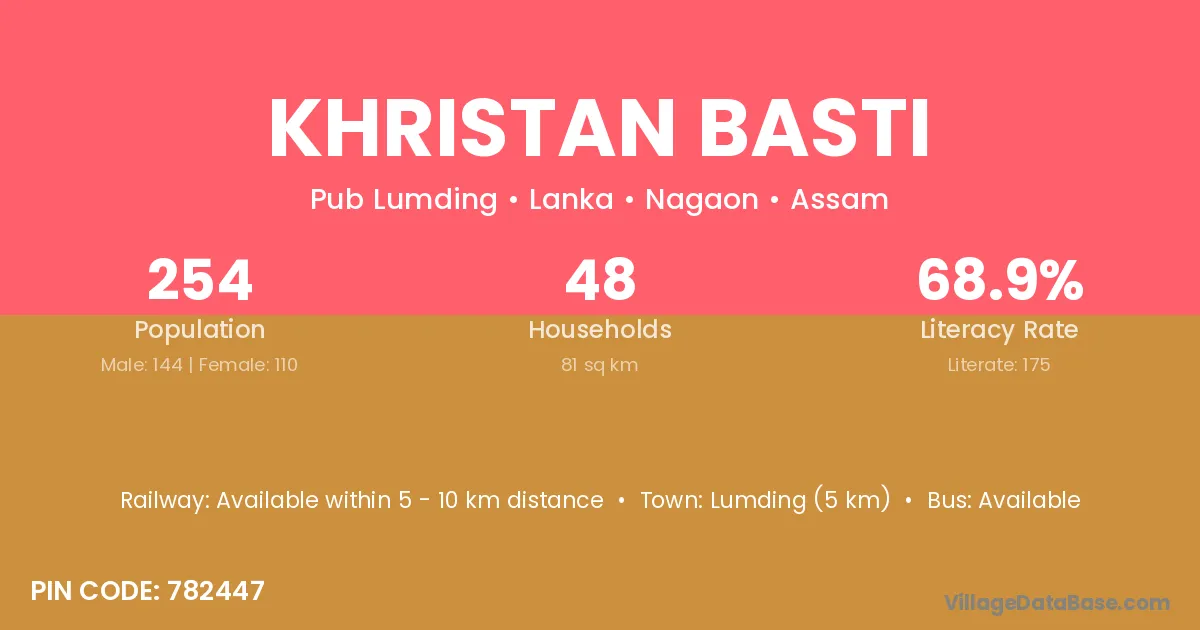 Lumding (5 km) is the nearest town to Khristan Basti village for major economic activities and is located approximately 5 km away.