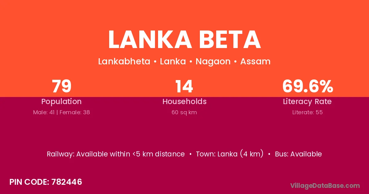 Lanka Beta village has a total population of 79 people, of which 41 are males and 38 are females.