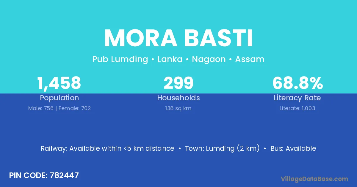 Lumding (2 km) is the nearest town to Mora Basti village for major economic activities and is located approximately 2 km away.