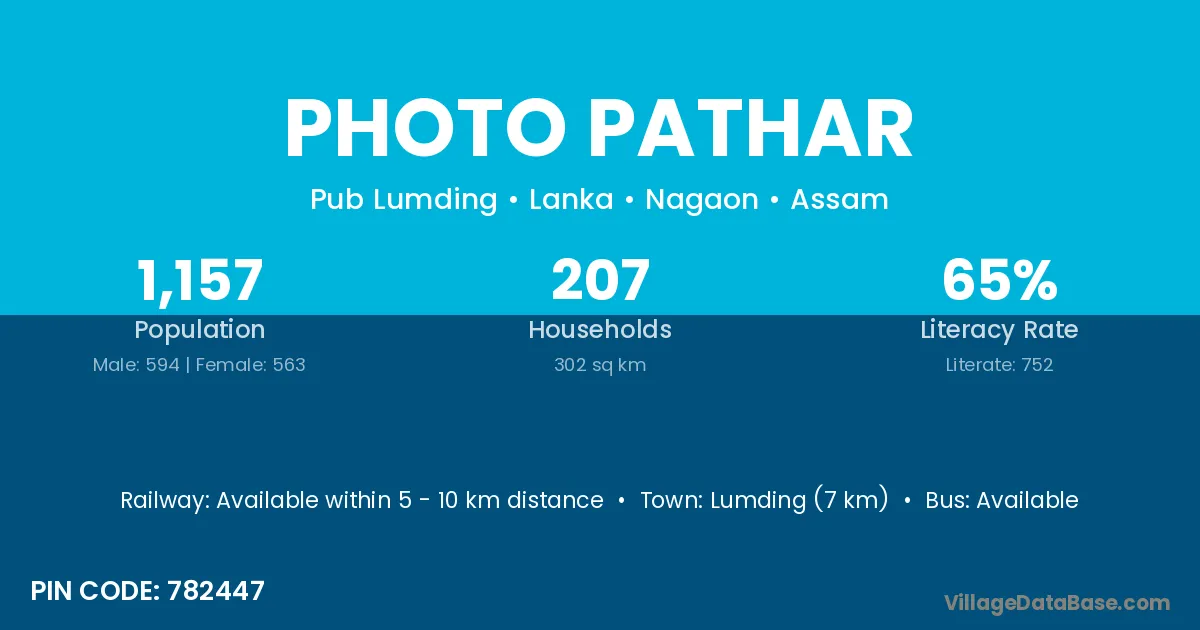 Lumding (7 km) is the nearest town to Photo Pathar village for major economic activities and is located approximately 7 km away.