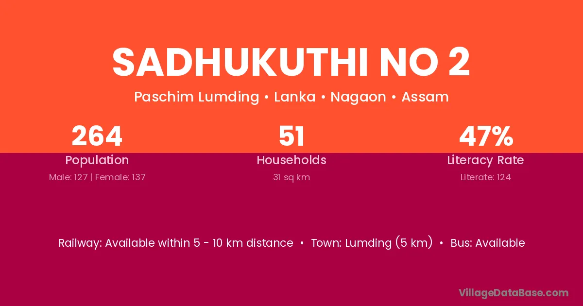 Lumding (5 km) is the nearest town to Sadhukuthi No 2 village for major economic activities and is located approximately 5 km away.
