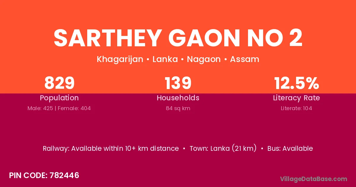 Lanka (21 km) is the nearest town to Sarthey Gaon No 2 village for major economic activities and is located approximately 21 km away.
