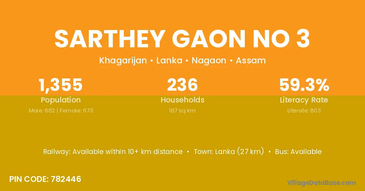 Lanka (27 km) is the nearest town to Sarthey Gaon No 3 village for major economic activities and is located approximately 27 km away.