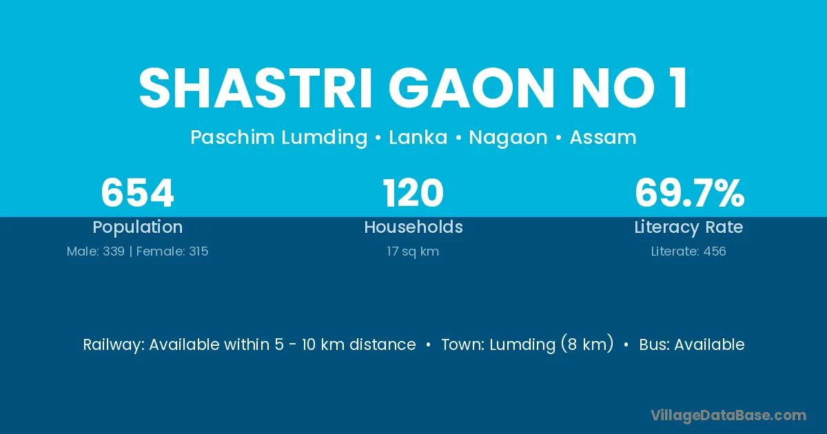 Lumding (8 km) is the nearest town to Shastri Gaon No 1 village for major economic activities and is located approximately 8 km away.
