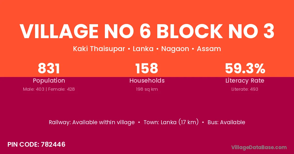 Village No 6 Block No 3 village has a total population of 831 people, of which 403 are males and 428 are females.