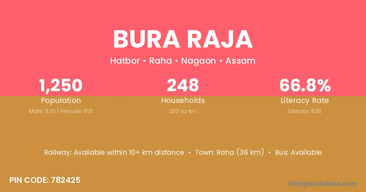 Raha (36 km) is the nearest town to Bura Raja village for major economic activities and is located approximately 36 km away.