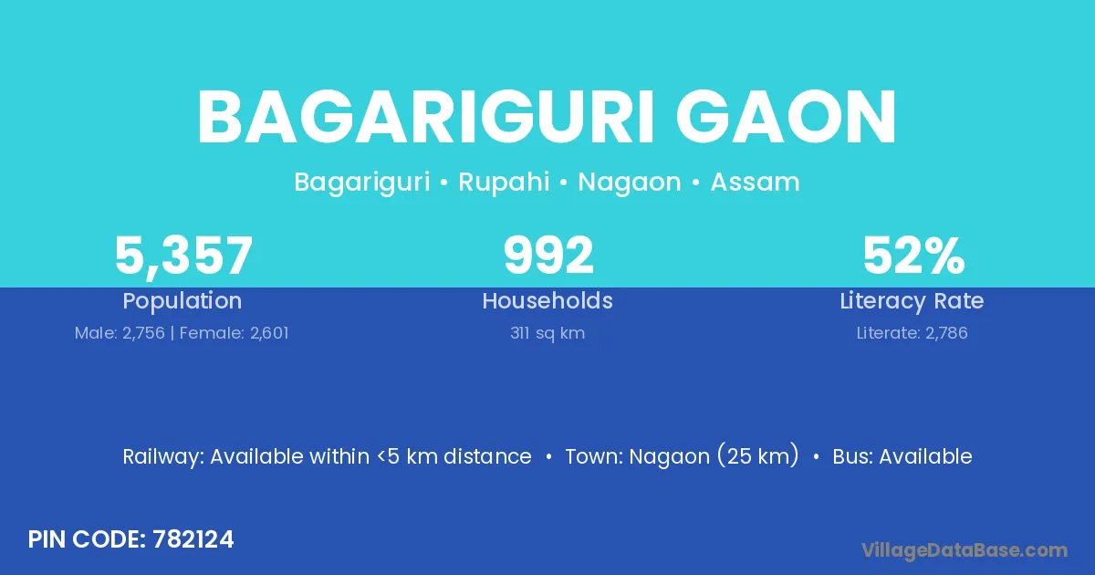 Nagaon (25 km) is the nearest town to Bagariguri Gaon village for major economic activities and is located approximately 25 km away.