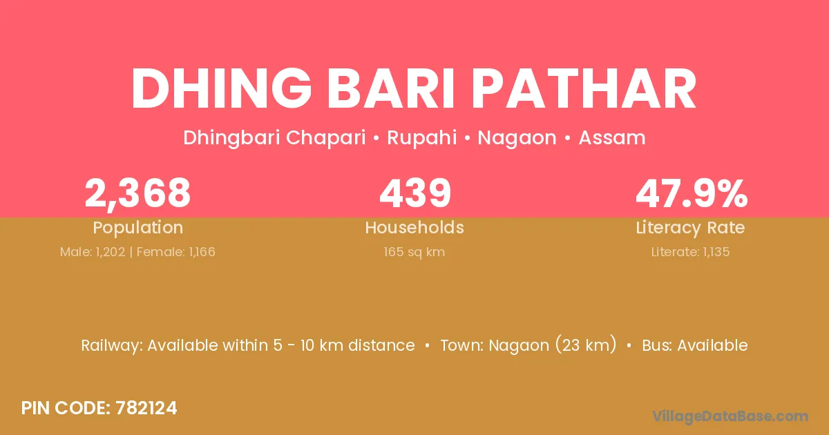 Dhing Bari Pathar village has a total population of 2,368 people, of which 1,202 are males and 1,166 are females.