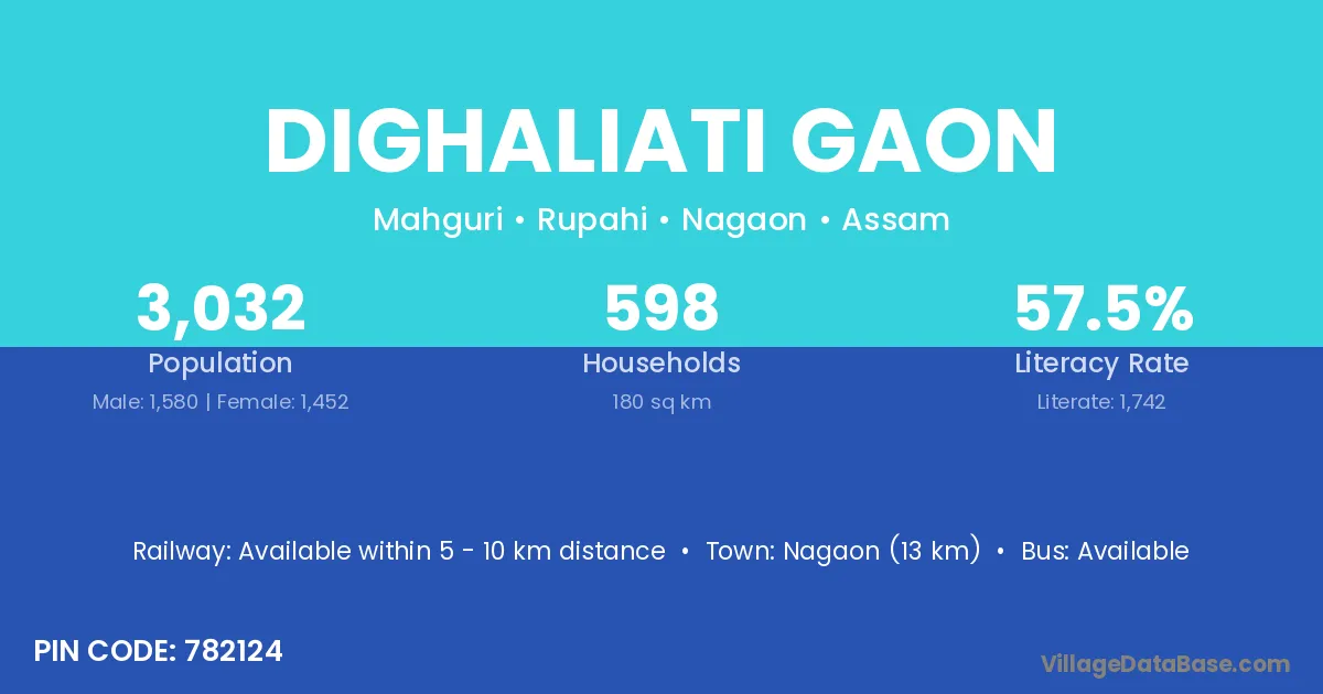 Nagaon (13 km) is the nearest town to Dighaliati Gaon village for major economic activities and is located approximately 13 km away.