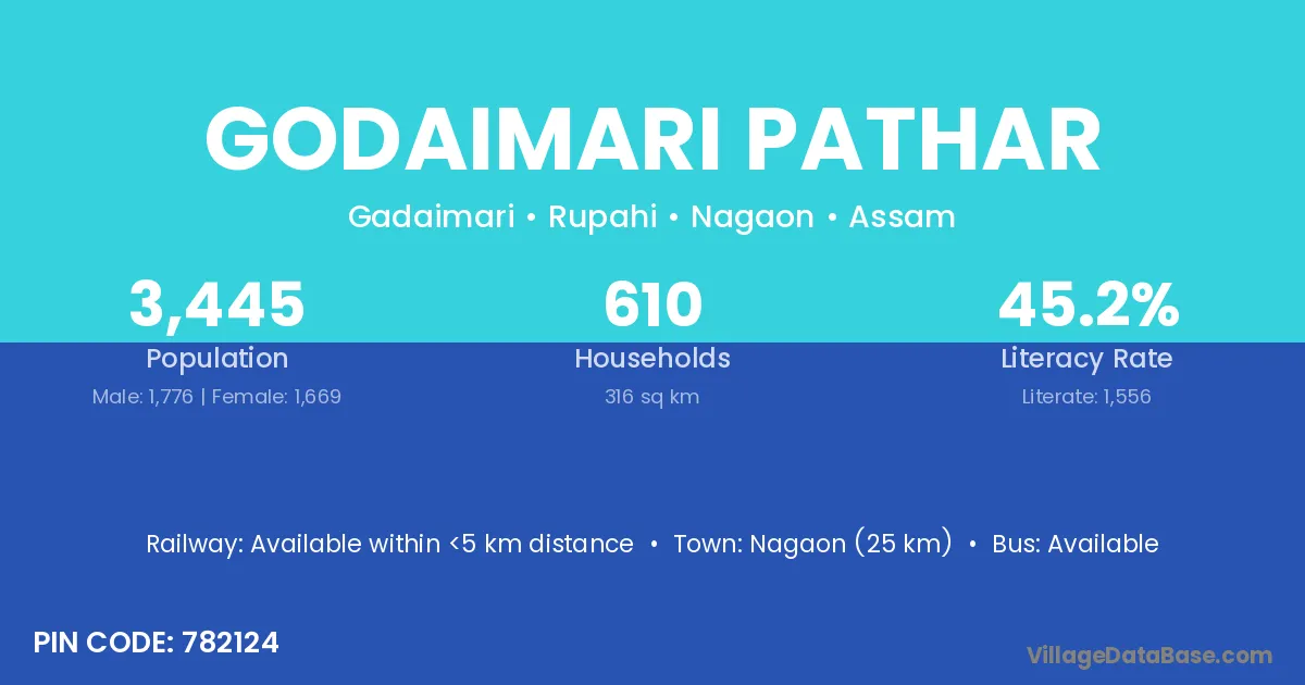 Nagaon (25 km) is the nearest town to Godaimari Pathar village for major economic activities and is located approximately 25 km away.