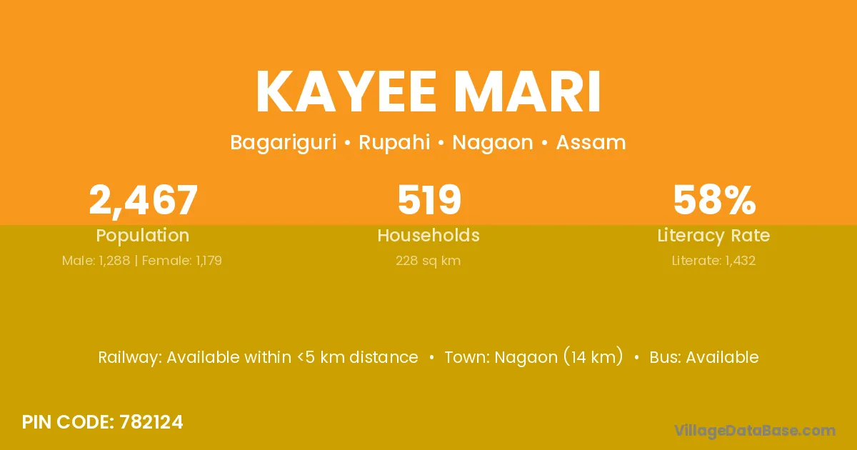 Nagaon (14 km) is the nearest town to Kayee Mari village for major economic activities and is located approximately 14 km away.