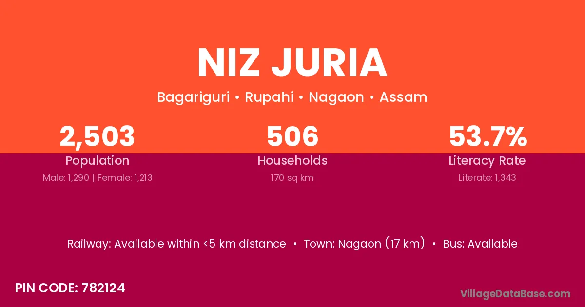 Nagaon (17 km) is the nearest town to Niz Juria village for major economic activities and is located approximately 17 km away.
