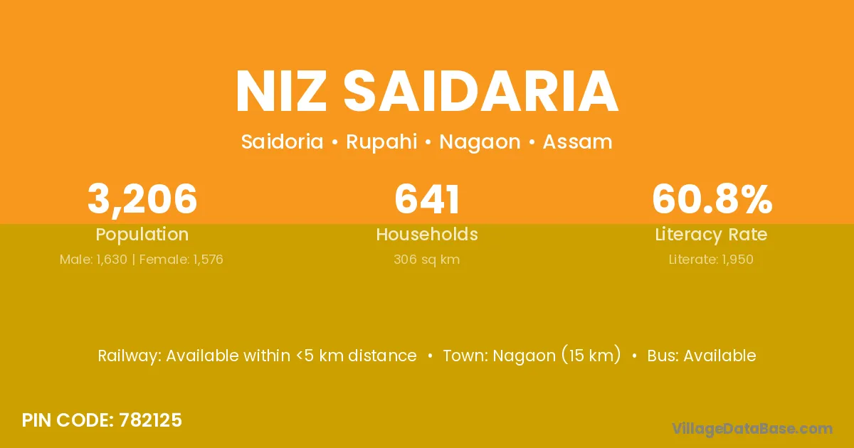 Nagaon (15 km) is the nearest town to Niz Saidaria village for major economic activities and is located approximately 15 km away.