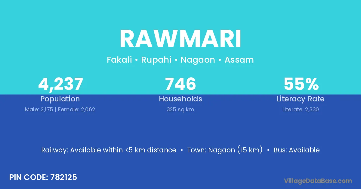 Nagaon (15 km) is the nearest town to Rawmari village for major economic activities and is located approximately 15 km away.
