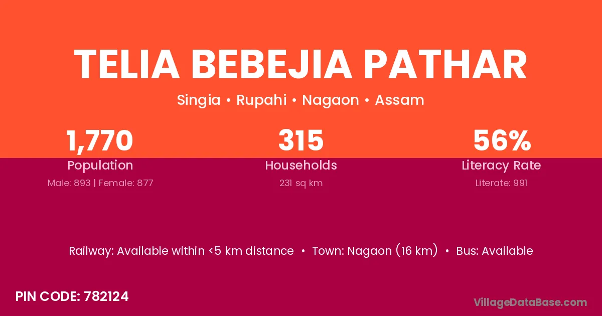 Nagaon (16 km) is the nearest town to Telia Bebejia Pathar village for major economic activities and is located approximately 16 km away.