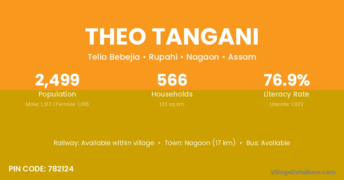 Nagaon (17 km) is the nearest town to Theo Tangani village for major economic activities and is located approximately 17 km away.