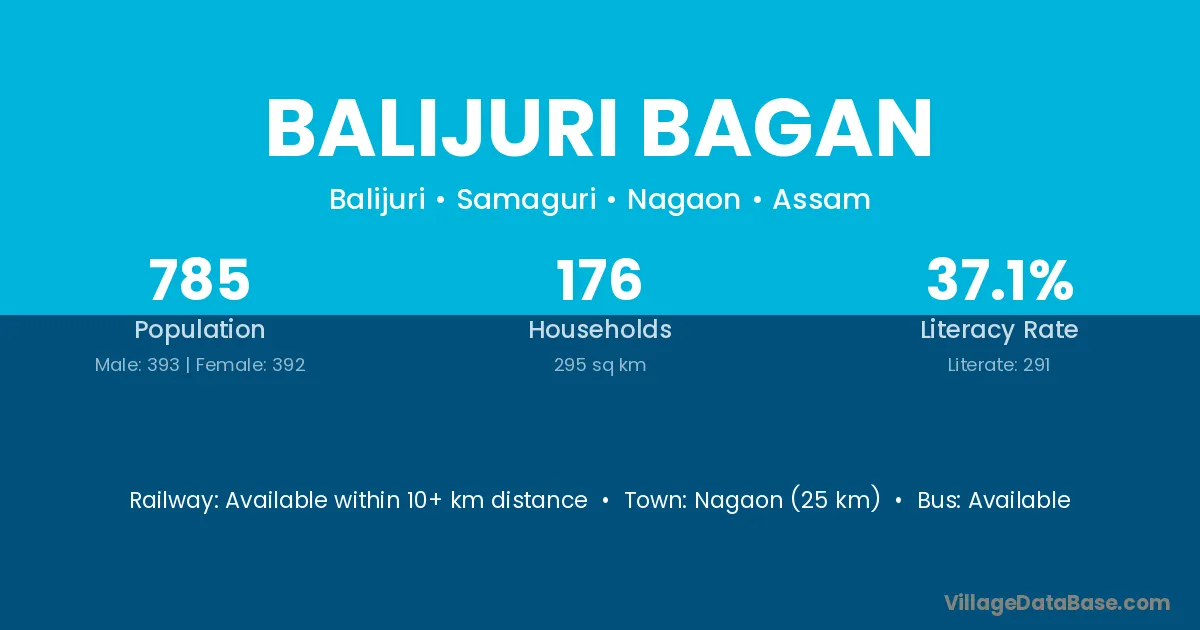 Nagaon (25 km) is the nearest town to Balijuri Bagan village for major economic activities and is located approximately 25 km away.
