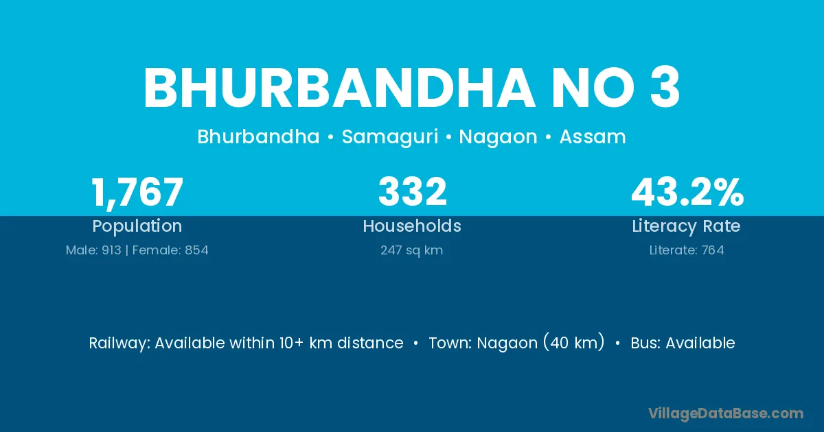 Nagaon (40 km) is the nearest town to Bhurbandha No 3 village for major economic activities and is located approximately 40 km away.
