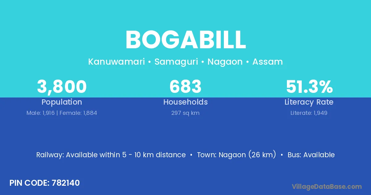 Nagaon (26 km) is the nearest town to Bogabill village for major economic activities and is located approximately 26 km away.