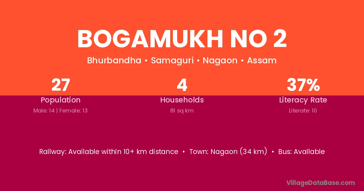 Bogamukh No 2 village has a total population of 27 people, of which 14 are males and 13 are females.