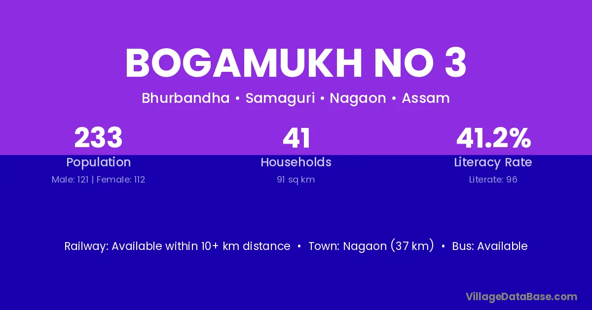 Bogamukh No 3 village has a total population of 233 people, of which 121 are males and 112 are females.