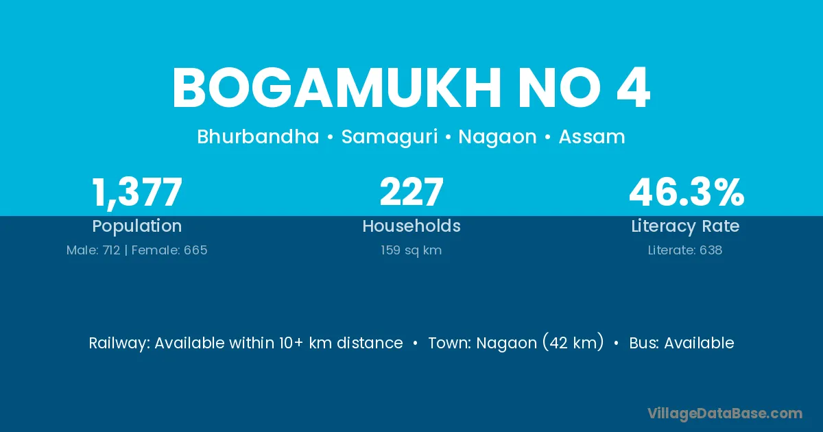 Bogamukh No 4 village has a total population of 1,377 people, of which 712 are males and 665 are females.
