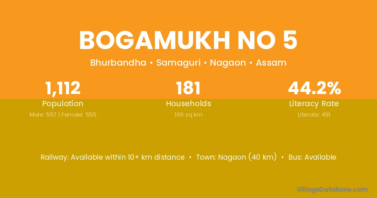 Bogamukh No 5 village has a total population of 1,112 people, of which 557 are males and 555 are females.