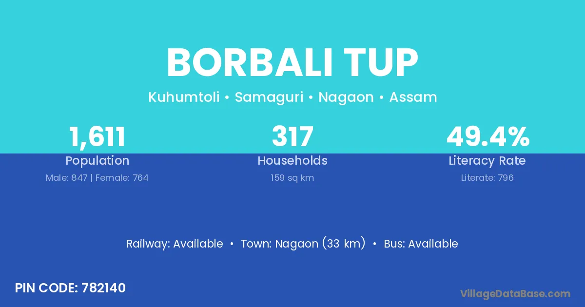Nagaon (33 km) is the nearest town to Borbali Tup village for major economic activities and is located approximately 33 km away.