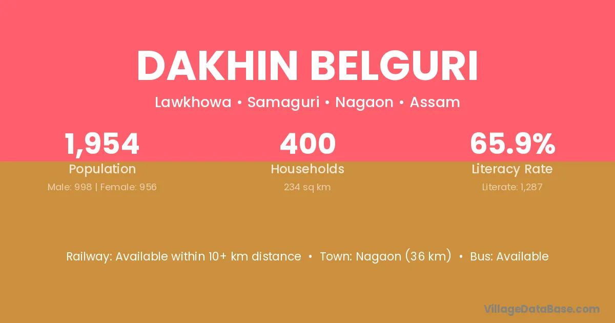 Nagaon (36 km) is the nearest town to Dakhin Belguri village for major economic activities and is located approximately 36 km away.