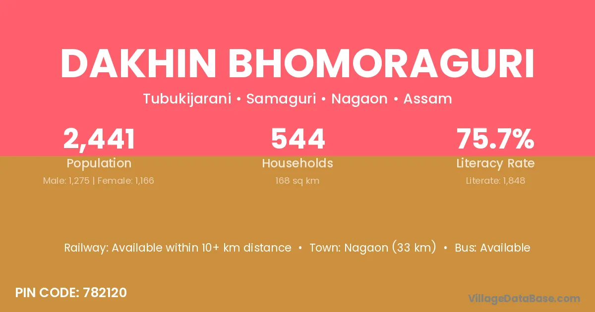 Nagaon (33 km) is the nearest town to Dakhin Bhomoraguri village for major economic activities and is located approximately 33 km away.