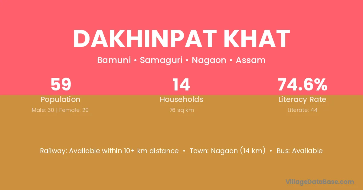 Dakhinpat Khat village has a total population of 59 people, of which 30 are males and 29 are females.