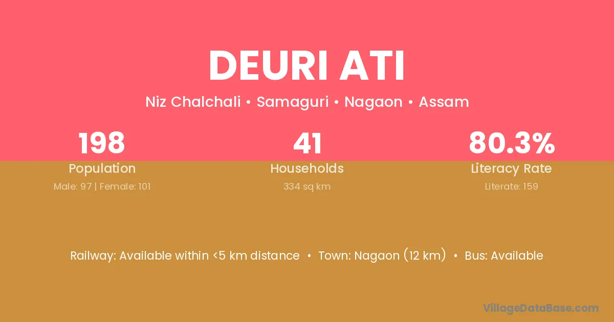 Nagaon (12 km) is the nearest town to Deuri Ati village for major economic activities and is located approximately 12 km away.