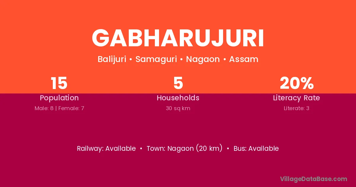 Nagaon (20 km) is the nearest town to Gabharujuri village for major economic activities and is located approximately 20 km away.